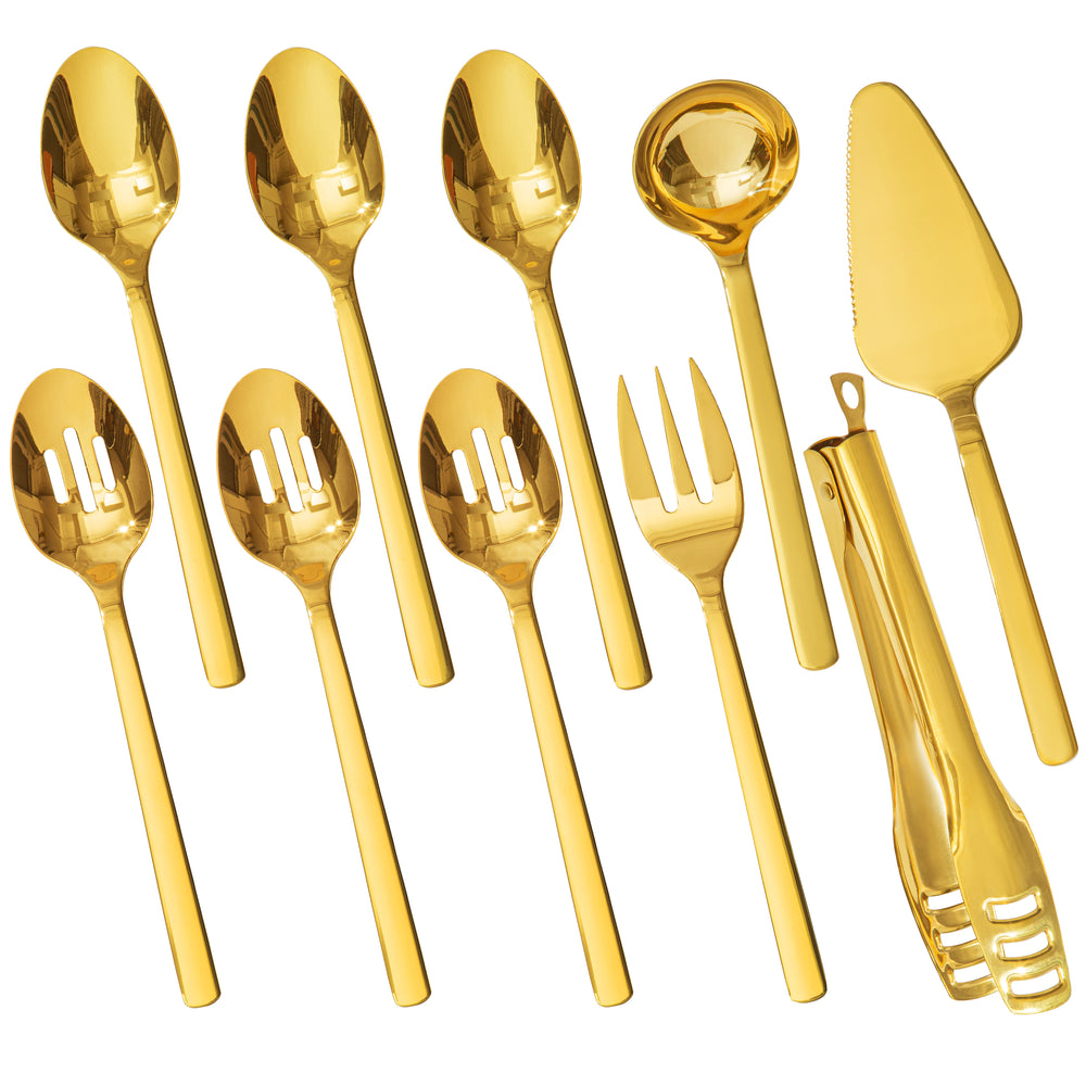1.8 Piece Serving Utensils Including: 2 Slotted Spoon(9.84 inches), 2 Serving Spoon(9.84 inches), 1 Serving Fork(10 inches), 1 Cake Server(10.9 inches), 1 Serving Tongs(10.62 inches),1 Gravy Ladle(8.46 inches).